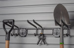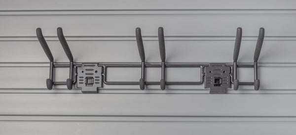 HandiWALL 24" Tool Bar With Hooks with Lock. Holds multiple brooms, shovels, rakes, and more. Features 3 sets of connected holders with rubberized double upper and double lower hooks. Easy to release and rearrange, the spring-loaded hook locks engage automatically to keep hooks in place on slatwall.