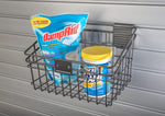 HandiWALL Deluxe Accessory Kit with 46 locking bracket slatwall hooks, baskets, and shelves for slatwall panels and garage organization. Easy to release and rearrange, the spring-loaded hook locks engage automatically to keep hooks in place on slatwall. Pieces are graphite colored steel construction with soft touch vinyl coating on hooks to help protect your items.