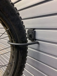 HandiWALL Fat Tire Bike Hook with Lock. Holds larger fat tire and mountain bikes vertically on slatwall. Also available in smaller standard size for road bikes.