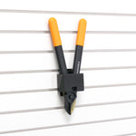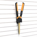 The Box Hook is a heavy-duty slatwall accessory designed for garage wall storage of sharp and bulky tools. Perfect for hanging storage of axes, shears, and trimmers, this garage wall organizer keeps dangerous tools safely secured and off the ground.