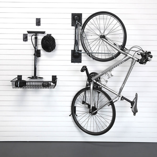 If you have multiple bikes, this solution is ideal for efficiently lining them up vertically anywhere on your slatwall. It allows you to store several bikes in a small space, keeping them safe and secure without the risk of damage. This setup not only saves space but also ensures your bikes are neatly organized and easily accessible whenever you need them.