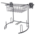 Holds all golf equipment in one place. Stores two bags and two pairs of shoes. Integrated basket holds dozens of balls, gloves, and other golf items. Coated spare club rack stores extra clubs.