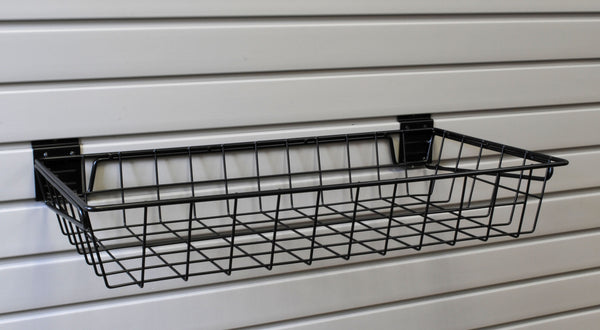 Features metal spring-loaded pin for snapping into slatwall. Unlimited storage uses for fertilizers, car supplies, toys, sports gear, and more. Ventilated basket allows air movement, visibility, and keeps harmful items out of reach.