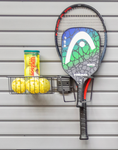 HandiWALL Tennis Accessory Holder. Holds both tennis and pickleball rackets with padded holder. Basket included to hold tennis balls and additional gear.