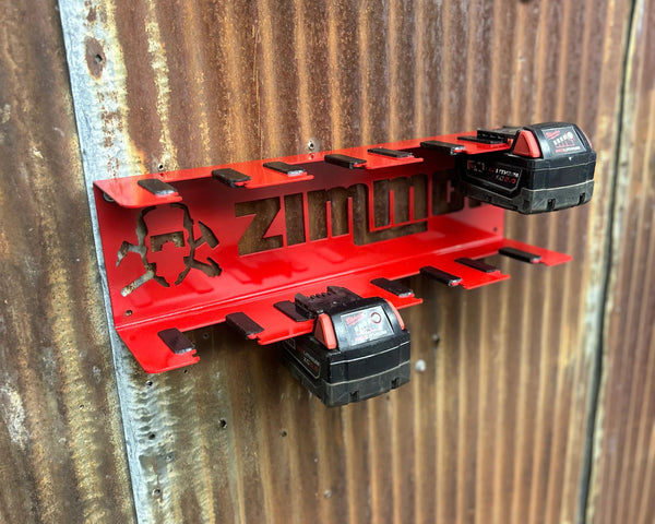 Keep your batteries organized and secure with the Milwaukee M18 8-Battery Rack from Zimmco – perfect for the shop or on the go.