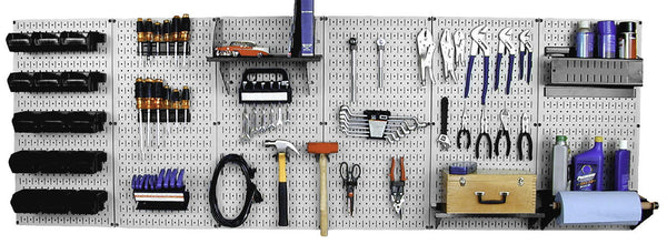 The Metal Pegboard Master Workbench Tool Storage Organizer Kit is easy to install and offers unmatched tool board storage versatility and strength with over 21 square feet of pegboard storage space. The Master Workbench Wall Tool Storage Kit is the ultimate wall organization system whether you are a professional tradesman, craftsmen, journeyman or the ultimate weekend warrior looking for your own personal garage wall organizer kit.