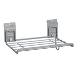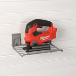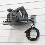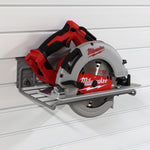 12" Garage Shelf with Cord Holder is a perfect complement to your power tool accessories. Designed specifically to store circle saws, battery chargers, and jig saws where the blades are protected with this unique wire garage shelf. The body of the power tool sits on the shelf, yet the circular or straight blade slides beneath the shelf. There is even a convenient hook attached to keep the cord tidy.