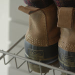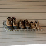 Angle Shelf features a vented design that allows drip drying of wet or muddy shoes. This wire shoe shelf can help create a pre-mud room in your garage and help with many of your garage storage needs. The 30 degree slope ensures that any dirt or moisture is wicked away from the wall for easy cleanup. This wire garage shelf easily holds 3 pairs of boots.