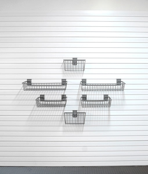 These durable and useful garage baskets will organize your things in a small space or a large garage. No matter what items are cluttering your space, this suite of baskets allows you to store objects easily and securely on your slatwall panels with minimal fuss.