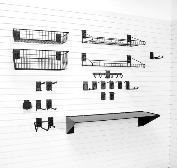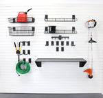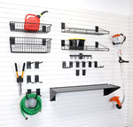 This bundle includes a variety of slat wall hooks, tool hooks, and garden hose hooks, as well as shelves and baskets for storing gardening tools, small equipment, and seasonal items. Whether you’re looking for rake and shovel storage, a shovel rack, or garden hose hanging ideas, this bundle has everything you need to maintain a tidy, accessible, and functional garage space.