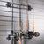 Safely stores four fishing rods with reels. Uniquely designed triangular hook secures rods in place. Heavy duty coating protects both rods and reels. Versatile mounting options accommodate any size pole.